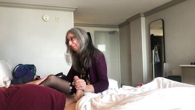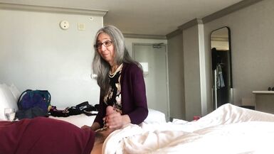 . A inexperienced man is masturbating in his hotel room when his Mom's friend walks in. He asks her to help him masturbate and she gives him a hand job to completion. Then she cleans him up.