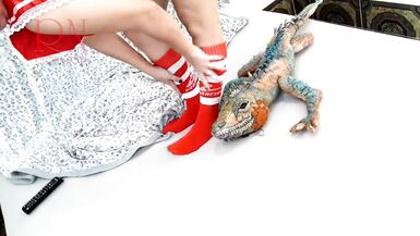 GIRL WITH SEXY SCHOOL UNIFORM IS DANCING WITHOUT PANTIES. STRIPTEASE WITH BIG IGUANA TOY. C3
