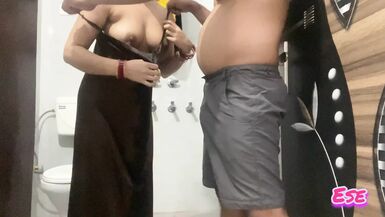 WHEN THE AUNT GOT WET, SHE TOOK OFF THE CLOTHES AND THEN THE NEPHEW HER FROM BEHIND.