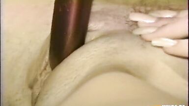HORNY BLONDE ENJOYS PLAYING WITH HER BUSH ON THE BED USING A TOY