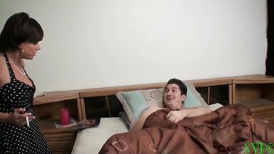 . Tyler's in his bedroom whacking off to a photo he found of his stepmother. Suddenly she bursts into his room smoking a cigarette and sees him in bed all covered up. When she lifts the blanket, she finds him naked with the picture of him next to her. Now she's really mad and she starts to lay into him. The funny thing is she can't seem to take her eyes off of his cock. While she's still bitching at him, her hand reaches down and starts to stroke his cock. When Tyler asks her what she's doing her mouth goes down to his cock and she starts to stroke and suck him. Soon she hikes up her dress and straddles his face. When his cock is hard, she mounts him and starts to fuck him. She loves his big inexperienced cock in her and soon has her first orgasm. Tyler fucks her in several positions while she smokes. He finally gets her on her knees and has her suck his cock until he cums in her hot smoky mouth.