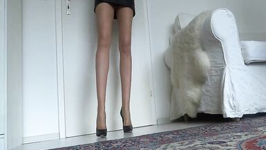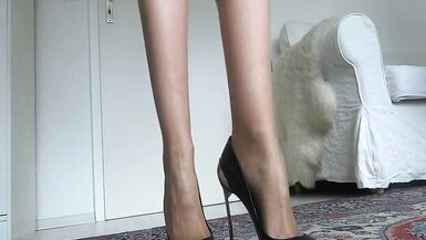 . Today a small legs and high heels show for you. I show you my black leather pumps stiletto high heels on my perfect legs. I'm wearing skin-colored, very thin pantyhose with a very short leather skirt. I stagger up and down a bit, nice posings! I sometimes slip out of my shoe. Close-ups of the high heels. More clips from me on other sites...